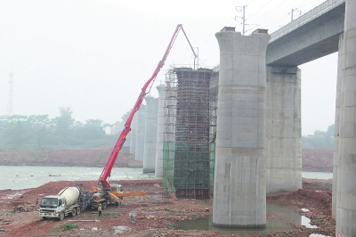 当日上午,记者在项目施工现场看到,湍急的青衣江水在一根根高耸的铁路桥墩旁奔流而过,一台台工程机具正轰鸣着进行施工作业,河床中央一台混凝土灌浆机伸出长臂,正紧张地浇筑大渡河特大桥18号桥墩。