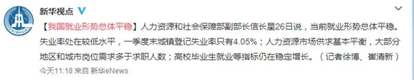 记者26日从新华社新华视点微博获悉,人力资源和社会保障部副部长信长星26日说,当前就业形势总体平稳。失业率处在较低水平,一季度末城镇登记失业率只有4.05%;人力资源市场供求基本平衡,大部分地区和城市岗位需求多于求职人数;高校毕业生就业等指标仍在稳定增长。