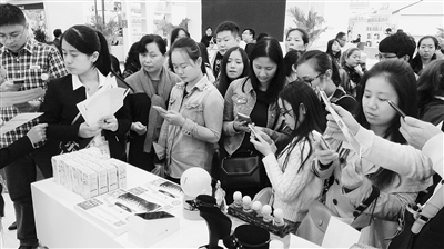西博会展馆内,广大会员通过手机登录“乐山造”电商平台参与活动。 市商务局供图